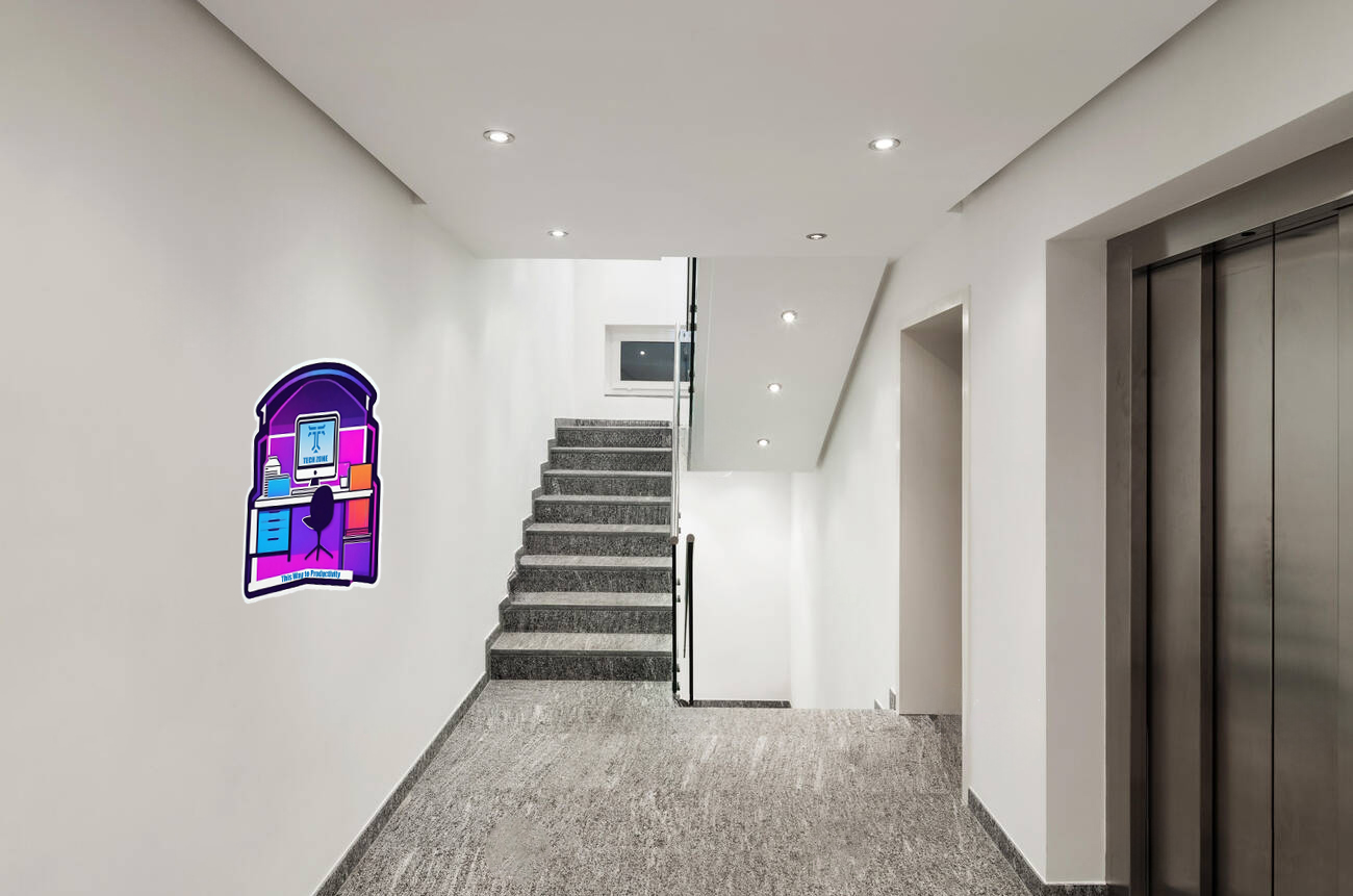 Co-working spaces. This sticker indicates “This Way to Productivity.” – Along hallways or near elevators.